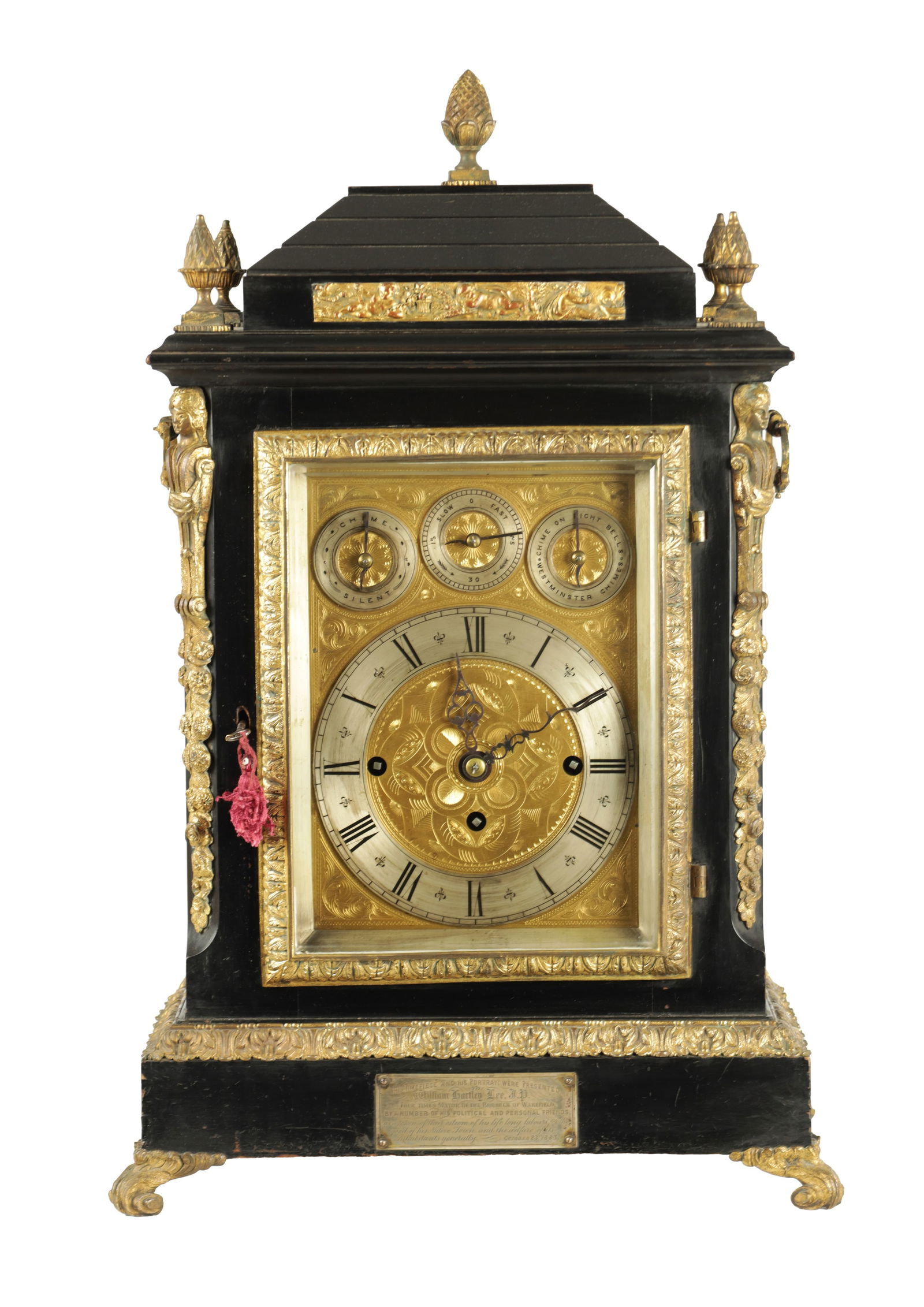 A LATE 19TH CENTURY EBONISED AND ORMOLU MOUNTED TRIPLE FUSEE BRACKET CLOCK