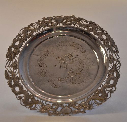 SoldWang Hing, HK; Large Round Chinese Silver TrayWang Hing, Hong Kong; Large Round Chinese Silver Tray, the curving border engraved and pierced with Orchids, the center with a well engraved Dragon; marks to bottom and 3 attached feet. Total weight 9See Sold Price