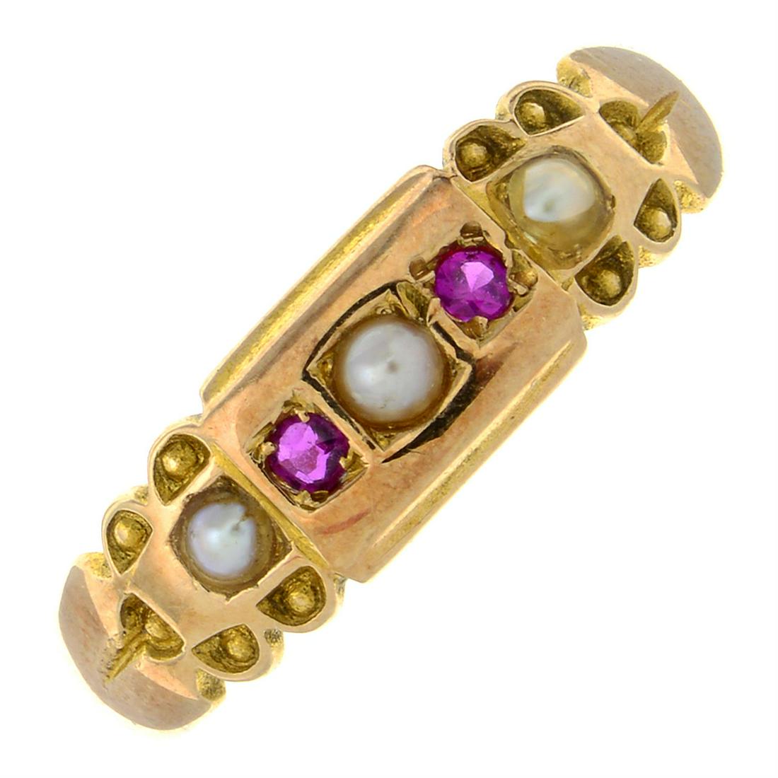A late Victorian 15ct gold ruby and split pearl dress ring.