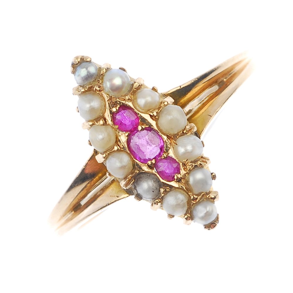 SoldA mid 20th century 15ct gold ruby and split pearl ring.A mid 20th century 15ct gold ruby and split pearl ring. Of marquise-shape outline, the graduated spilt pearl line, within a vari-shape ruby surround, to the tapered band. Foreign marks. Ring size L 1/See Sold Price