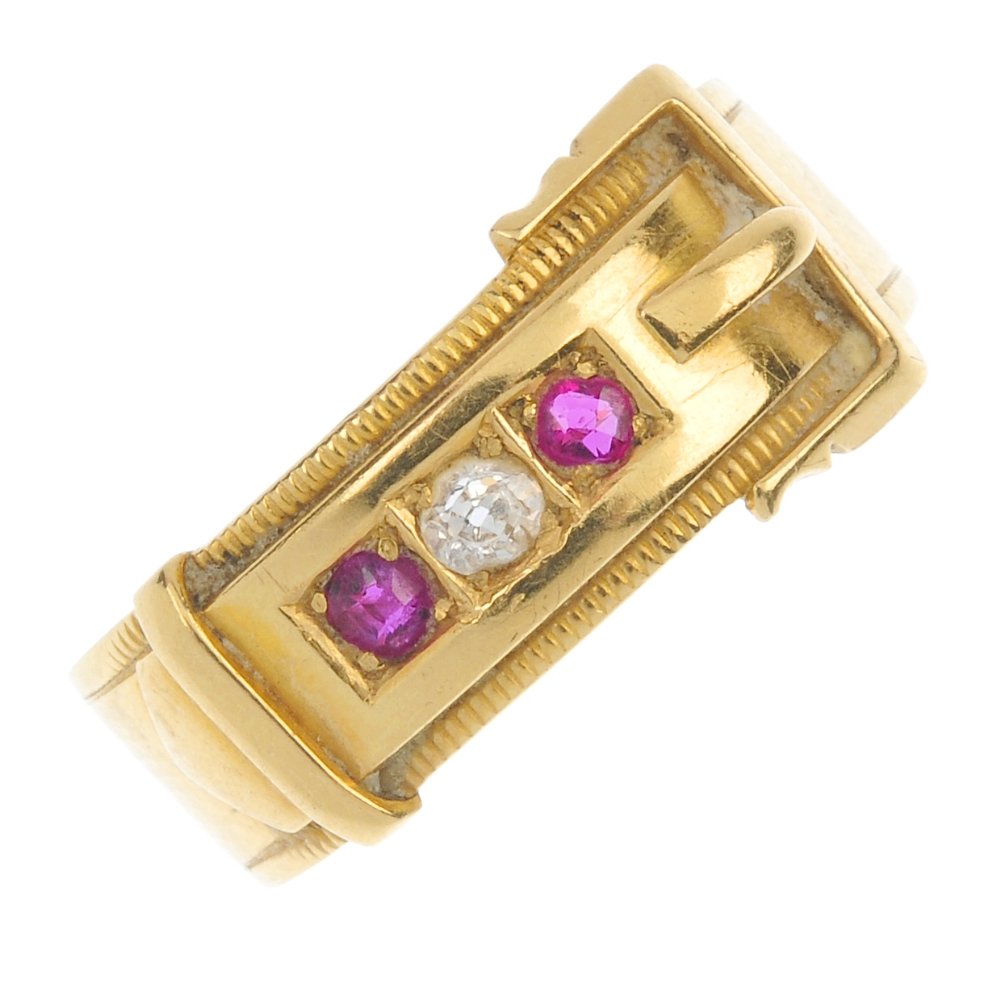 A late Victorian 18ct gold diamond and ruby buckle ring