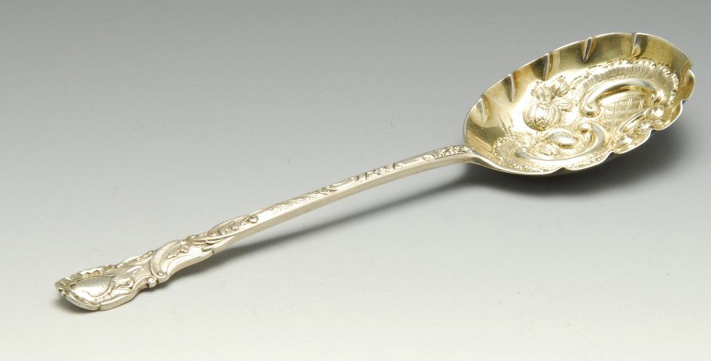 SoldA small selection of Victorian & later flatware, etc.A late Victorian decorative silver spoon, having an oval bowl embossed with floral baskets and fruiting cornucopia and a spiral twist stem with further embossing, hallmarked Goldsmiths & SilversmithsSee Sold Price