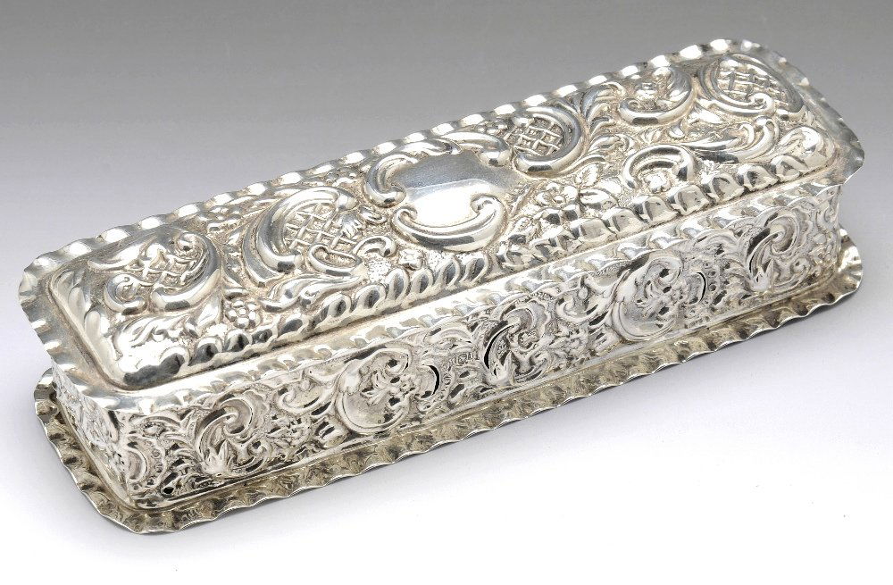 SoldVictorian English Silver Vanity BoxVictorian English silver vanity box by Goldsmith & Silversmiths Company London Regence Street, repoussed with serpentines and floral design, London 1890, mark to lip and base, maker's mark rubbed, 5.1See Sold Price