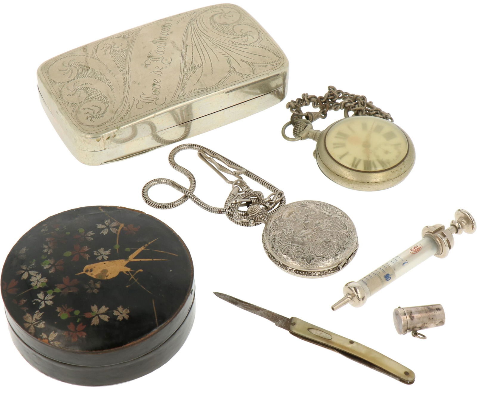 Miscellaneous Lot3 days LeftLot of Miscellaneous ItemsMar 05, 2026Lot of Pocket Watches & StopwatchMar 04, 2026Lot of Costume Jewelry & 2 Trinket BoxesMar 03, 2026Lot of Kitchen, Desk, & Dresser ItemsMar 04, 2026HUGE ANTIQUE DEALER LOT: PAINTINGS, SILVER, ETC.Mar 07, 2026Antique Pocket Watch Parts Lot – Assorted Watch Movements, Dials, and Cases in Display BoxMar 04, 2026LOT ANTIQUE BRONZE BOXES, VANITY ITEMS, ETCMar 07, 2026Lot of Travel Clocks, Antique Locks, & John F. Kennedy MatchbooksMar 04, 2026Lot of sterling silver accessories and tableware. To include: Chinese wise man figural shakers, O.Mar 01, 2026Estate Lot of 5 Antique Chinese & Bronze: Box, Bottle, Tray, Vase & Leather WalletMar 15, 2026MILITARY MEDALS,MISCELLANEOUS LOT3 days LeftVICTORIAN JEWELRY/DIP PEN LOT3 days LeftLot of Costume Jewelry2 days LeftGROUP LOT OF SILVER ITEMS6 days LeftMILITARY MEDALS, WATCH CHAINS LOT3 days Left