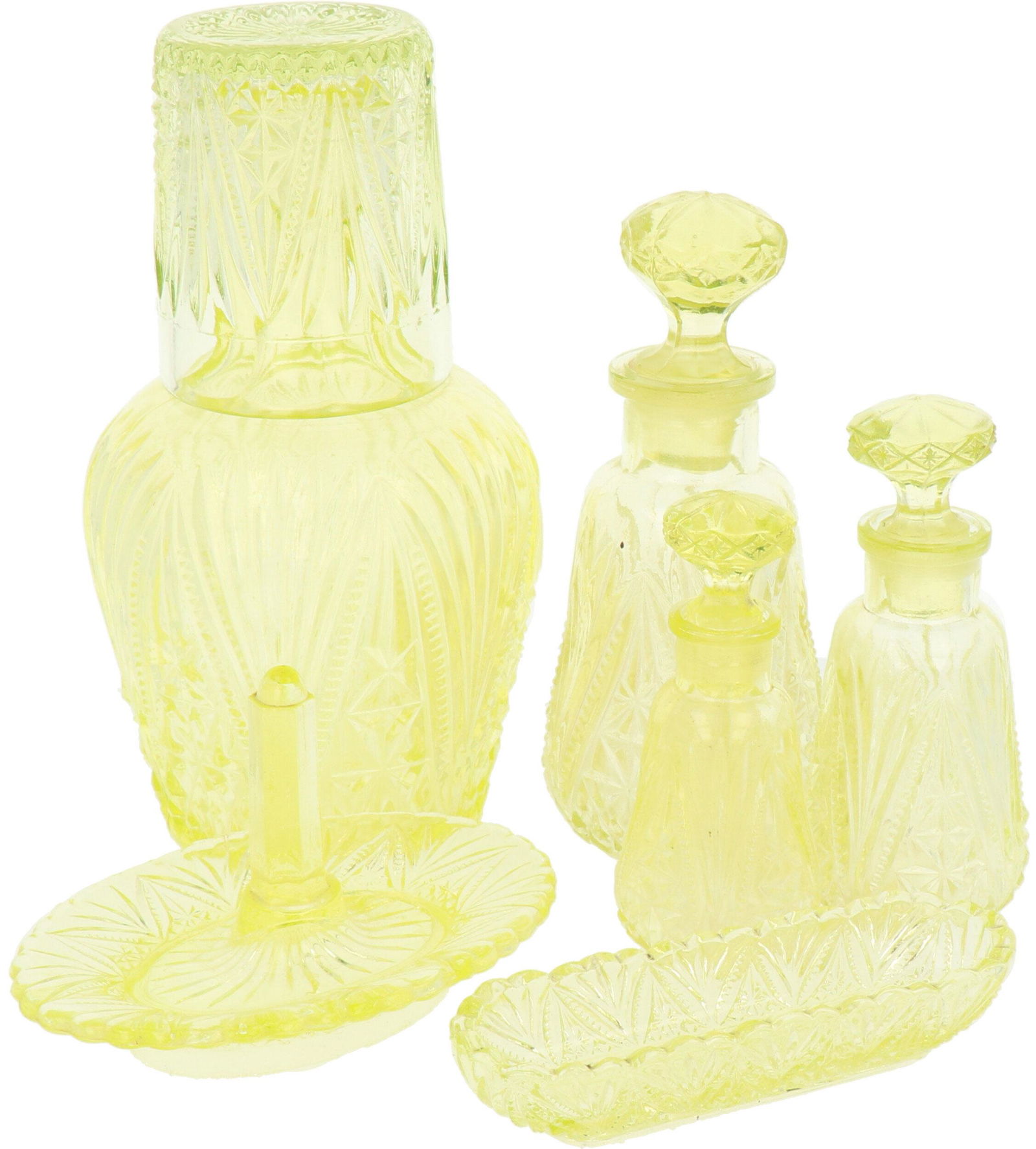 Various Vintage Art Glass Vanity Items 5pc LOTFeb 26, 2026Cut Glass Perfume Bottles and Vanity Decanter LotFeb 27, 2026Lot of 4 Cut Glass Crystal Decanters3 days LeftLot of Cut Crystal & Glass Servers, Lamp, Pitcher.Feb 28, 2026Apothecary Pharmacy Medicine Glass Bottles 9pc LOTFeb 26, 2026LOT OF LIGHT BLUE HAND BLOWN MURANO STYLE DECANTERS AND CANDLE HOLDERS3 days LeftAmerican Uranium Vaseline Glass Collection, Featuring Mosser Glass (Cambridge, OH) and Westmoreland1 day LeftAmerican Iridescent Uranium Vaseline Glass Grouping, Featuring Tiffin Glass and Fostoria Heirloom,1 day LeftAmerican Uranium Vaseline Glass Collection, Featuring Anchor Hocking, Cambridge Glass Company, 20th1 day LeftSigned Iridescent Studio Art Glass Perfume BottlesFeb 26, 2026ANTIQUE VASELINE/URANIUM GLASSWARE VASE CUP (3)Mar 07, 2026SIX ANTIQUE CUT GLASS & CRYSTAL SCENT BOTTLES, ETCMar 07, 2026(6) BOHEMIAN STYLE COLOR CUT-TO-CLEAR CRYSTAL VASES2 days LeftA Collection of 4 EAPG Pressed Glass Tableware Articles8 hrs Left(6) Studio Glass Perfume BottlesFeb 25, 2026Pr. Bohemian Glass Covered Goblets, Mary Gregory DecanterMar 04, 2026