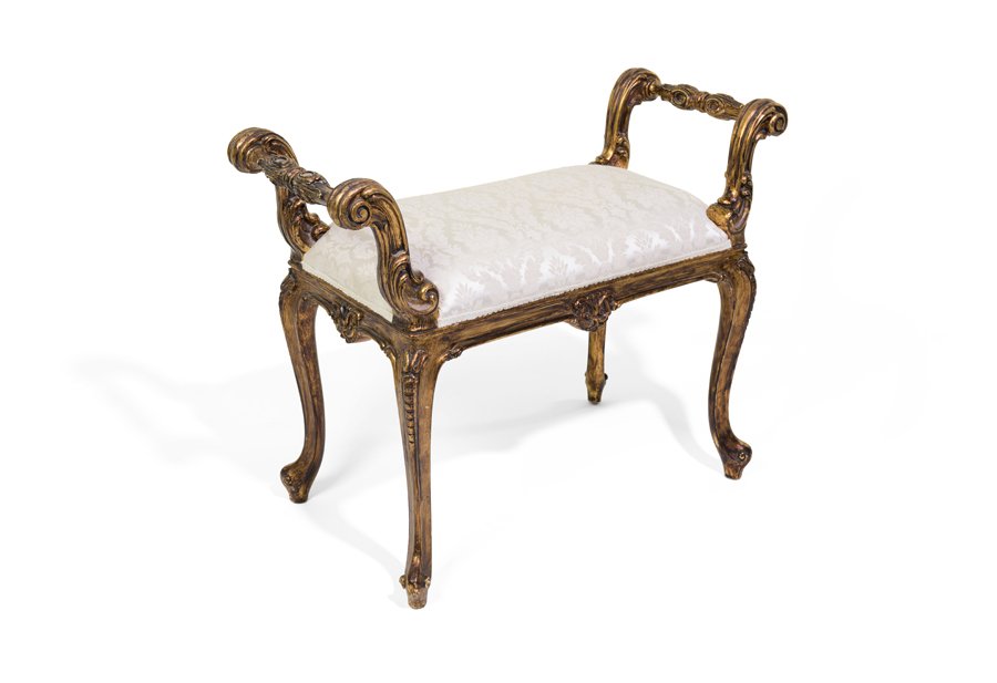 SoldLouis XV-style Upholstered StoolA Louis XV-style stool with pink and gold silk upholstery on a painted and gilt carved base with cabriole legs. Provenance: From a Rittenhouse Square, Philadelphia apartment designed by interior desigSee Sold Price