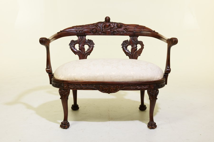 SoldMahogany heavily carved love seat with lion headsMahogany heavily carved love seat with lion heads on arms, Attrib. to Karpen, 44 in. T, 63.5 in. W, 23.5 in. D.See Sold Price
