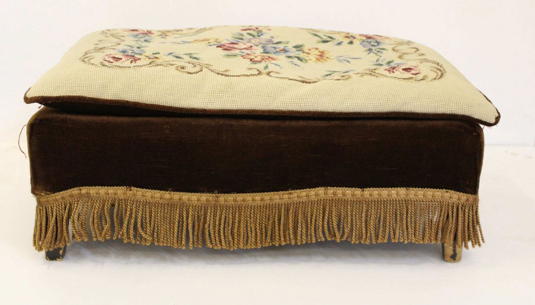 A low rectangular footstool, upholstered in brown