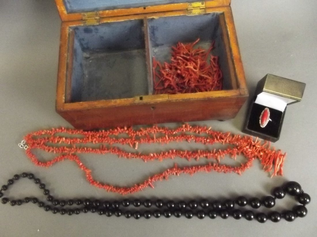 A mahogany caddy box containing a double string coral