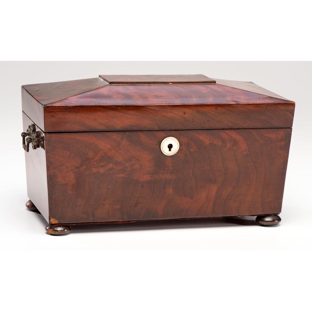 SoldGeorge II Mahogany Tea CaddyGeorge II Mahogany Tea Caddy, ca. 1765, the block-front case with conforming molding and feet, opening to a tripartite compartment, the center one fitted with a brass-covered glass tea canister, h. 5"See Sold Price