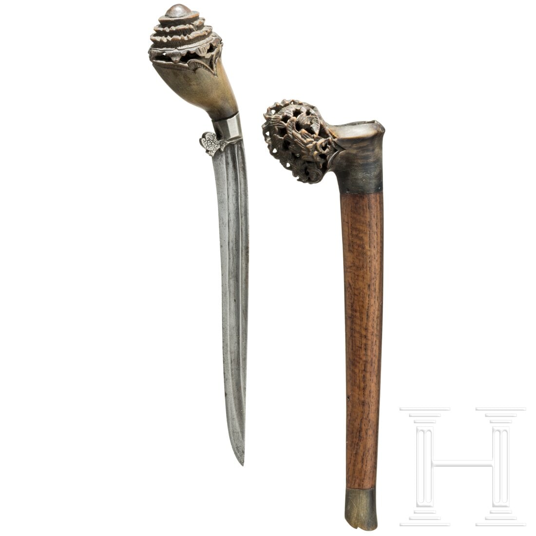 SoldA Malaysian bade bade, circa 1900A Malaysian bade bade, circa 1900Geschwungene, am Ansatz geschnittene Klinge, facettierter Griffknebel aus Eisen. Fein beschnitzter Griff aus Elfenbein und en suite beschnitzte Scheide aus Elfenbein.See Sold Price