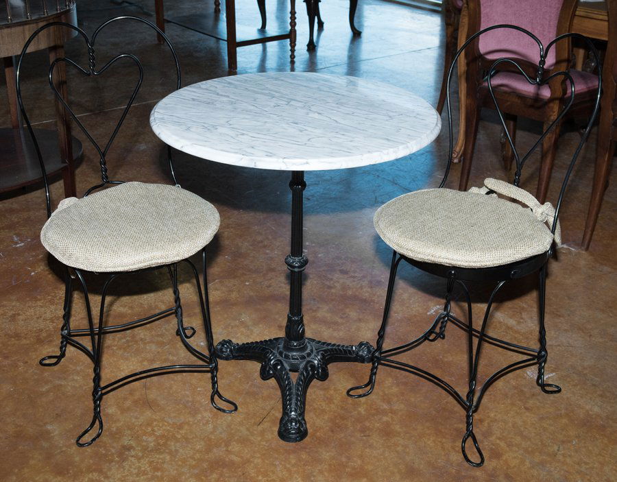 SoldMarble Top Ice Cream Parlor TableWith two curved metal chairs. Table top shows discoloration and signs of wear but is not chipped or cracked. On cast iron tripod base. Table is 24 inches wide x 29.5 inches tall. Chairs have decorativSee Sold Price