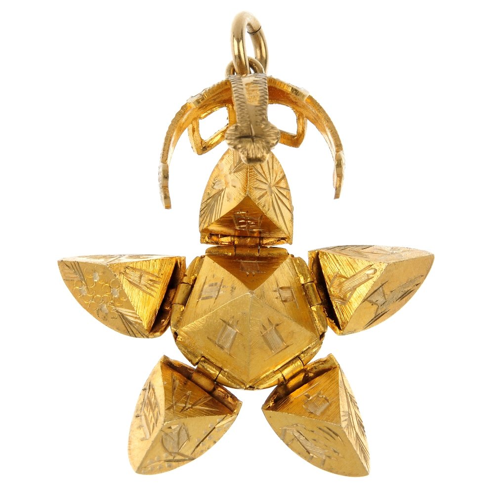 SoldA Masonic ball pendant. Designed as a sphere, unfurlingA Masonic ball pendant. Designed as a sphere, unfurling to reveal a cross with engraved Masonic symbols. Length 2.6cms. Total weight 9gms. Overall condition good with light surface scratches and smallSee Sold Price