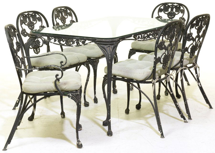 Sold7 PIECE CAST METAL PATIO SET7 PIECE CAST METAL PATIO SET, TABLE IS 72 IN X 48 IN, 6 ARM CHAIRS, INCLUDES UMBRELLA HOLDERSee Sold Price