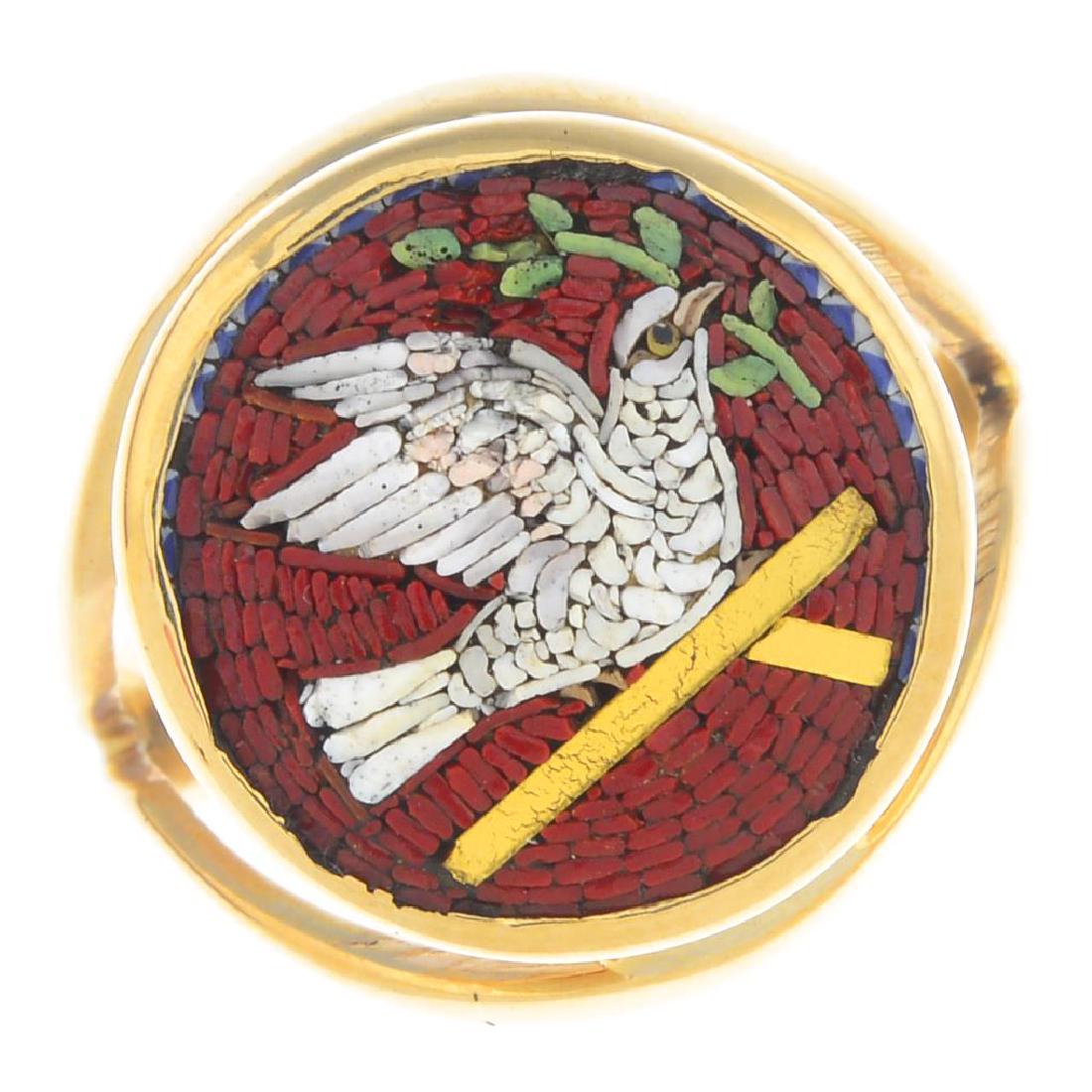 A micro mosaic bird ring. The circular panel depicting