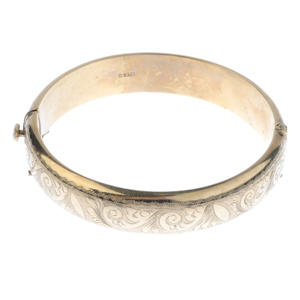 A mid 20th century 9ct gold hinged bangle. Designed as