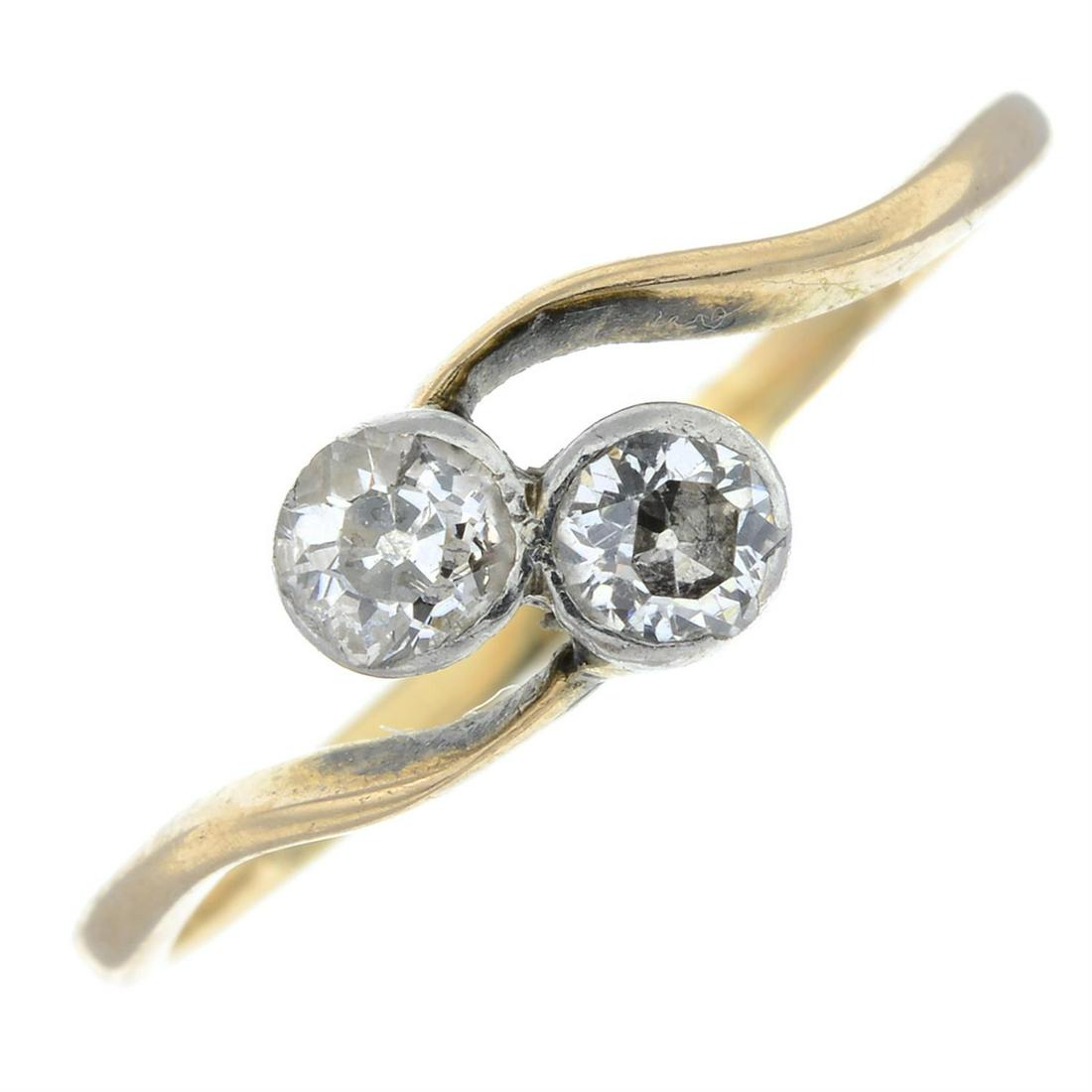 A mid 20th century old-cut diamond two-stone crossover ring.