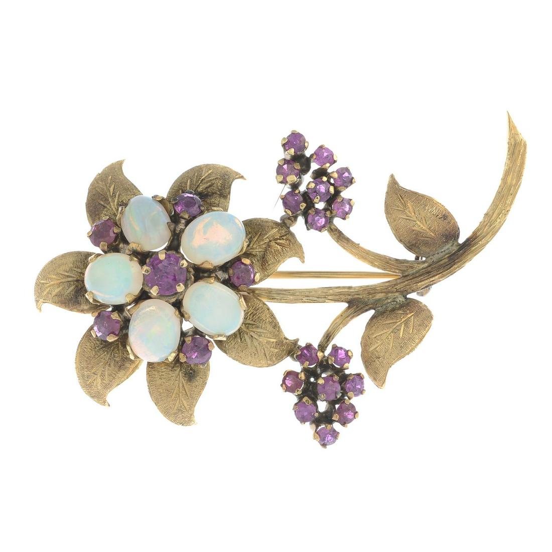 A mid 20th century opal and ruby floral brooch. Length