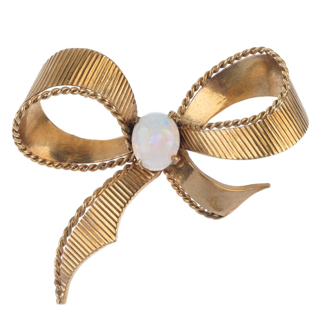 A mid 20th century opal bow brooch.