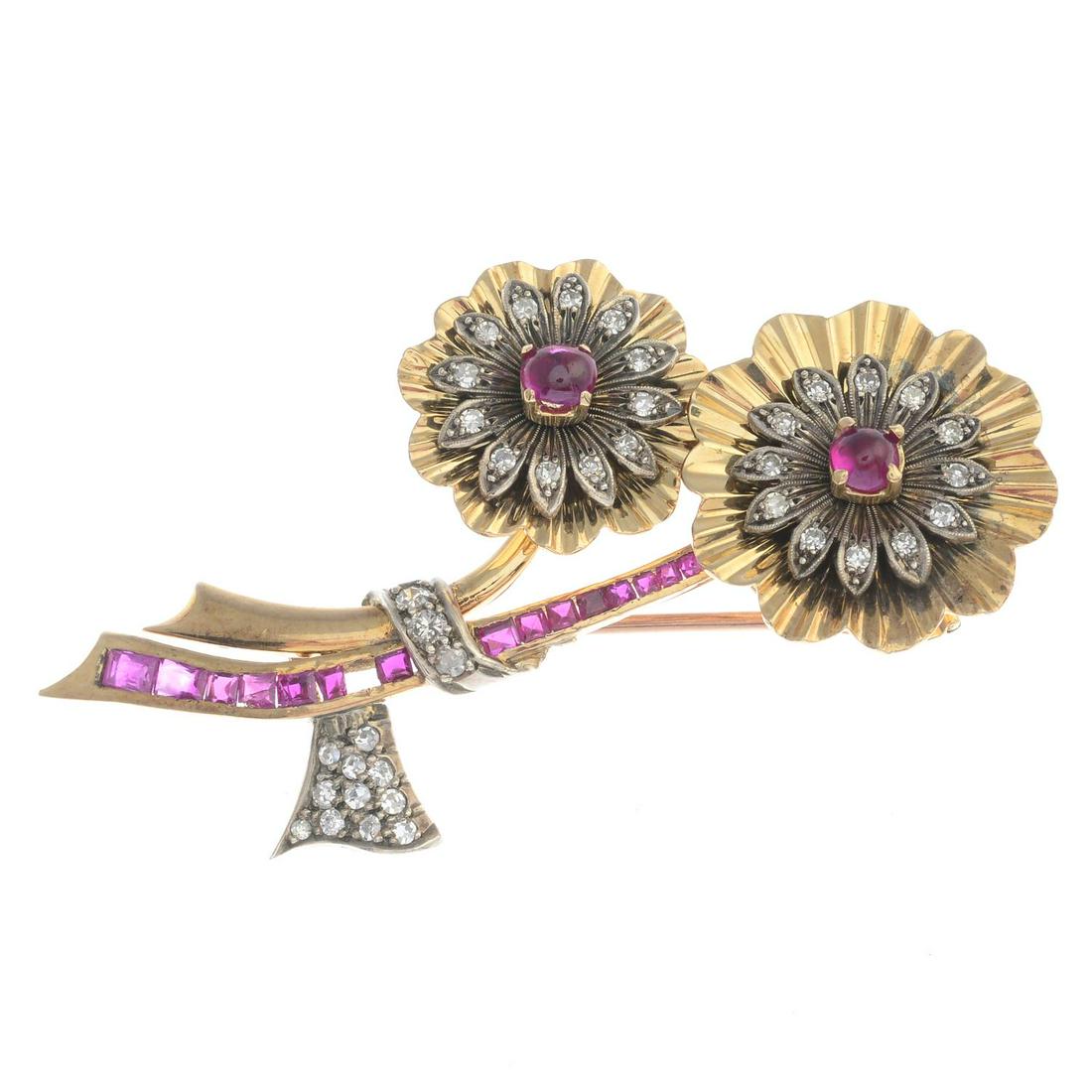 A mid 20th century ruby and diamond flower brooch. One