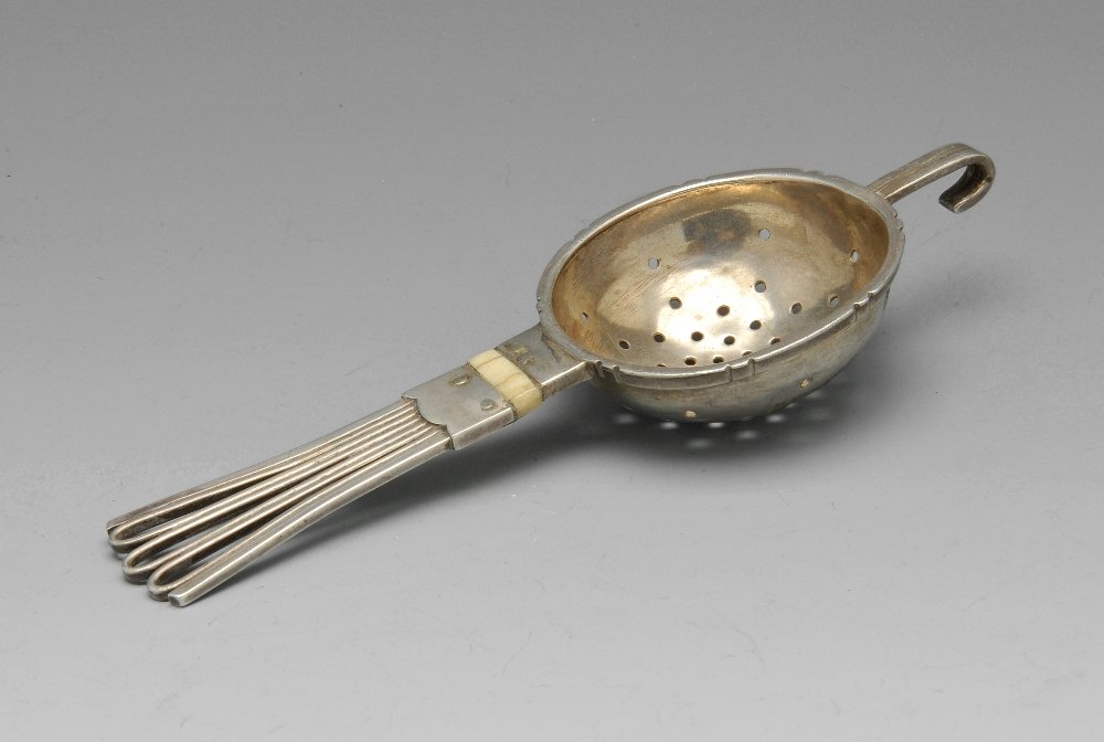 SoldHanau German Silver Tea StrainerHanau German silver tea strainer. Marked 800 and with two makers stamps, the first a grape bunch and the second is illegible. Germany, mid 19th century. 800 silver, 2.33 ozt. L 6 1/4&See Sold Price