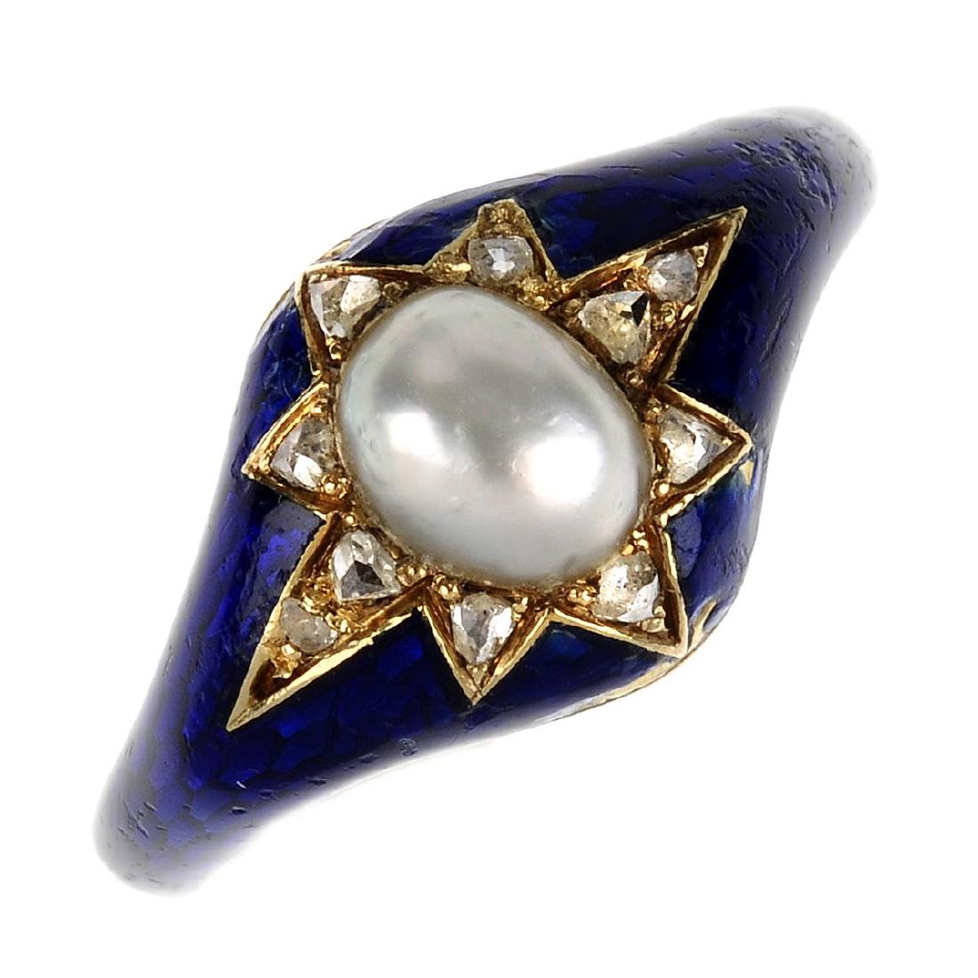 A mid Victorian diamond, split pearl and enamel ring.