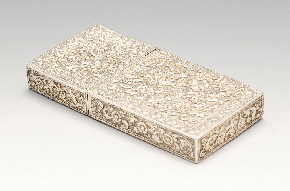 Antique .900 Fine Silver Persian Qajar Cigarette CaseFeb 28, 2026A RUSSIAN SILVER AND NIELLO CIGARETTE BOX2 days LeftA piece of Liao Jin's agate-covered gold Buddha pattern lid boxFeb 27, 2026A Large Indian Papier-MâchĂ© Qalamdan Pen Case with Gilded Floral and Bird Motifs, 19th Century3 days LeftKashmir circa 1910 An early 20th century Anglo – Indian unmarked silver cigarette case3 days LeftA YEMENI JEWISH SILVER FILIGREE BESAMIM SPICE BOXMar 06, 2026AN ITALIAN RUBY-SET SILVER VANITY CASE FLORENCE, 1944-19684 days LeftA beautiful copper gilt inlaid Hetian jade Wufu longevity cover boxFeb 27, 2026Kashmir circa 1900 An early 20th century Anglo – Indian unmarked silver cigarette case3 days LeftVintage Gold & Black Ornate Cigarette Case w/Birds, Leaves & Floral MotifsMar 01, 2026Russian Silver Cigarette CaseMar 03, 2026A Chinese Carved White Jade Perfume Bottle3 days LeftIndo Persian Micro Mosaic Marquetry Jewelry BoxFeb 28, 2026Rangoon circa 1910 An early 20th century Burmese silver cigarette or cigar box3 days LeftCopper and Wood Lined Cigar Box, 1st Half 20th CenturyFeb 28, 2026Canton circa 1860 marked Khe Cheong A mid-19th century Chinese silver snuff box3 days Left