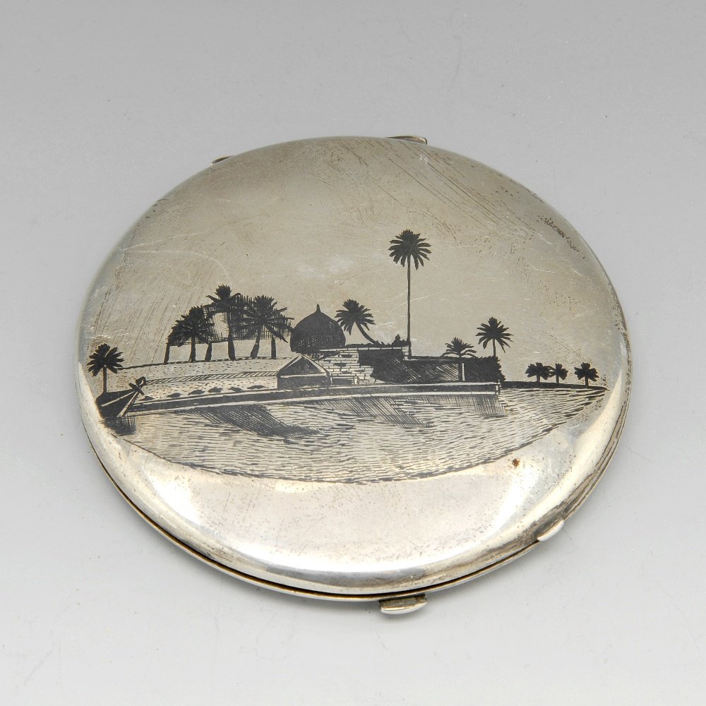 A Middle Eastern white metal compact.