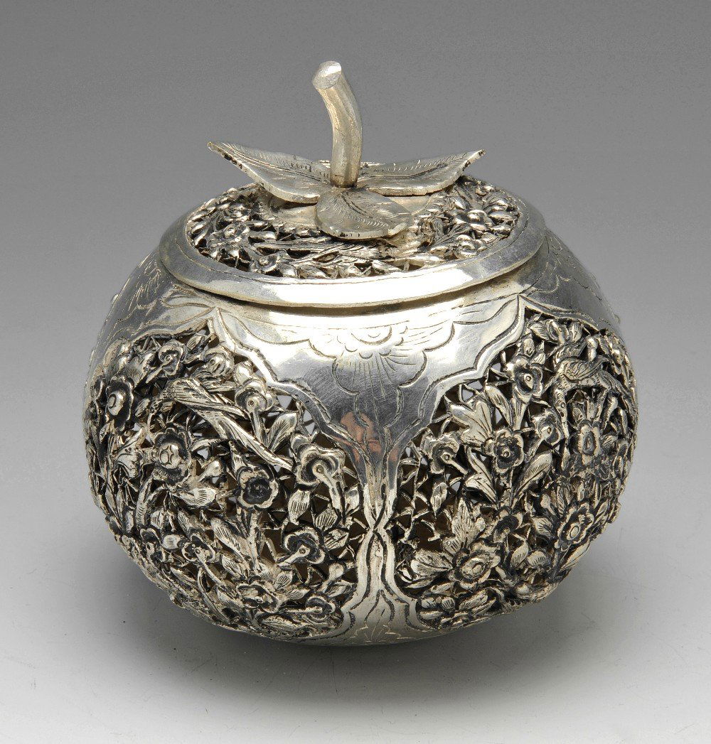Chinese silversmith. Lidded jar richly decorated in relief with flowers and ornaments.Antique Middle Eastern Silver Vase with Engraved DesignFeb 21, 2026An Islamic Silvered Copper Jar3 days LeftContinental Silver Sugar Box1 day LeftA SILVER FILIGREE SPICE CONTAINER IN THE SHAPE OF AN APPLEFeb 18, 2026A SILVER TORAH CROWN. Hungarian, 20th century.Feb 18, 2026Vintage Persian 875 or 900 Silver Lidded Box8 hrs LeftHandmade 925 Sterling Silver Floral Repousse Esrog Box 5.5 x 6.25 Inches1 day LeftJudaica Sterling Silver BoxFeb 18, 2026Small silver box 'flowers'6 days LeftAntique Middle Eastern brass container3 days LeftSilver basket with handle6 days LeftA Vintage Silver-Tone Footed Floral Trinket BoxFeb 15, 2026A SMALL SILVER HAMMERED BOWL AND COVERFeb 17, 2026A SMALL SILVER SPICE POMANDER. Modern.Feb 18, 2026Elegant silver covered jar, executed in neoclassical style with richly chiseled handles featuringFeb 15, 2026
