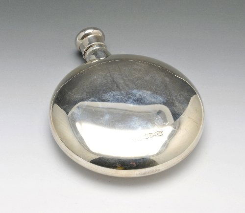 A modern circular silver hip flask.