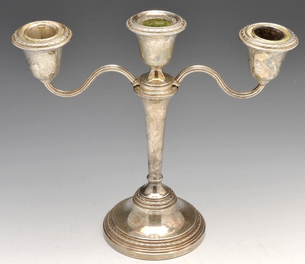 SoldSTERLING GEMENT FILLED SILVER CANDELABRASGorhai 1 Sterling Gement Filled Reiforced with rod of other metal 808H:8.75in(22.2cm) W:10.5in(26.6cm)See Sold Price