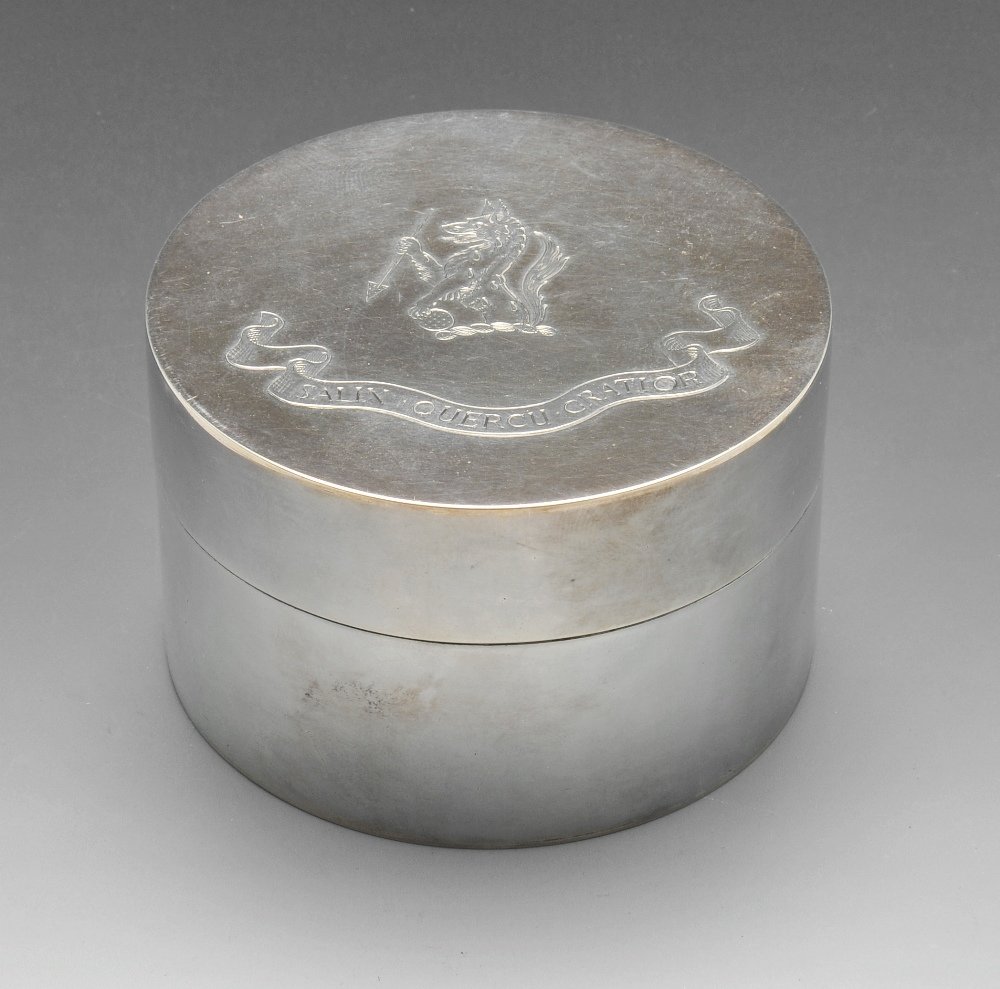 SoldTHREE STERLING SILVER CLAD BOXES: JAPANESE, ETC.Three sterling silver clad boxes. Two are Japanese: one with fitted lid and another with hinged lid- one decorated with a Kamon emblem, the other is engraved. The third box is engraved and monogrammedSee Sold Price
