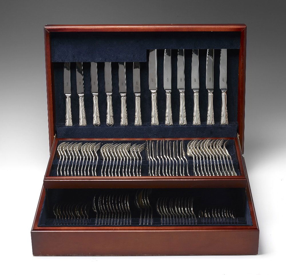 SoldChristofle flatware service for twelveChristofle silver-plated flatware service for twelve, in Rubans pattern, total 91 pieces to include: (12) modern hollow knives; (12) dessert knives; (12) luncheon forks; (12) dinner forks; (12) tablesSee Sold Price