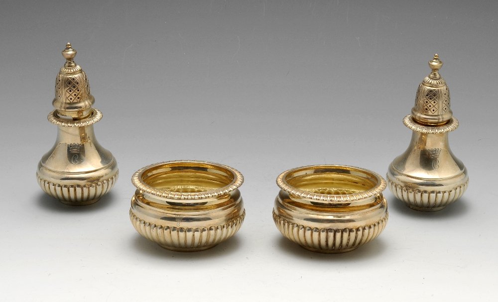 A modern silver four piece condiment set.