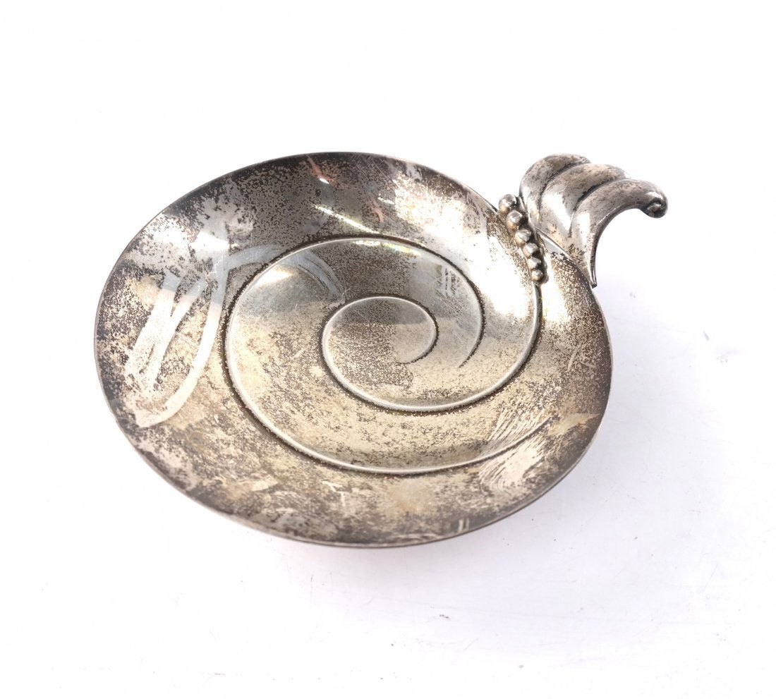 SoldGEORG JENSEN STERLING SILVER SMALL DISHGeorg Jensen Sterling Silver Small Dish. It is in good condition with normal surface scratches and there is no mono or mono removal. It measures 4 1/2" in diameter and 5" handle to handle. It weighs 2See Sold Price