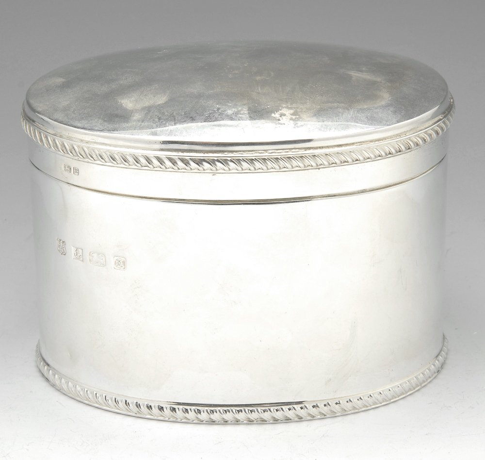SoldGeorge III English Silver Tea Caddy, Hester BatemanLondon, 1784, oval form with bead border, bright cut decoration, flat hinged cover, locking with key, oval cartouche with coat of arms, marks for Hester Bateman, .925 fine, 11.19 oz. T., 4-1/4 x 5-1/8See Sold Price