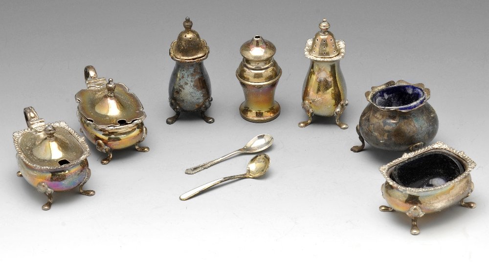 A modern silver three piece silver condiment set , etc.