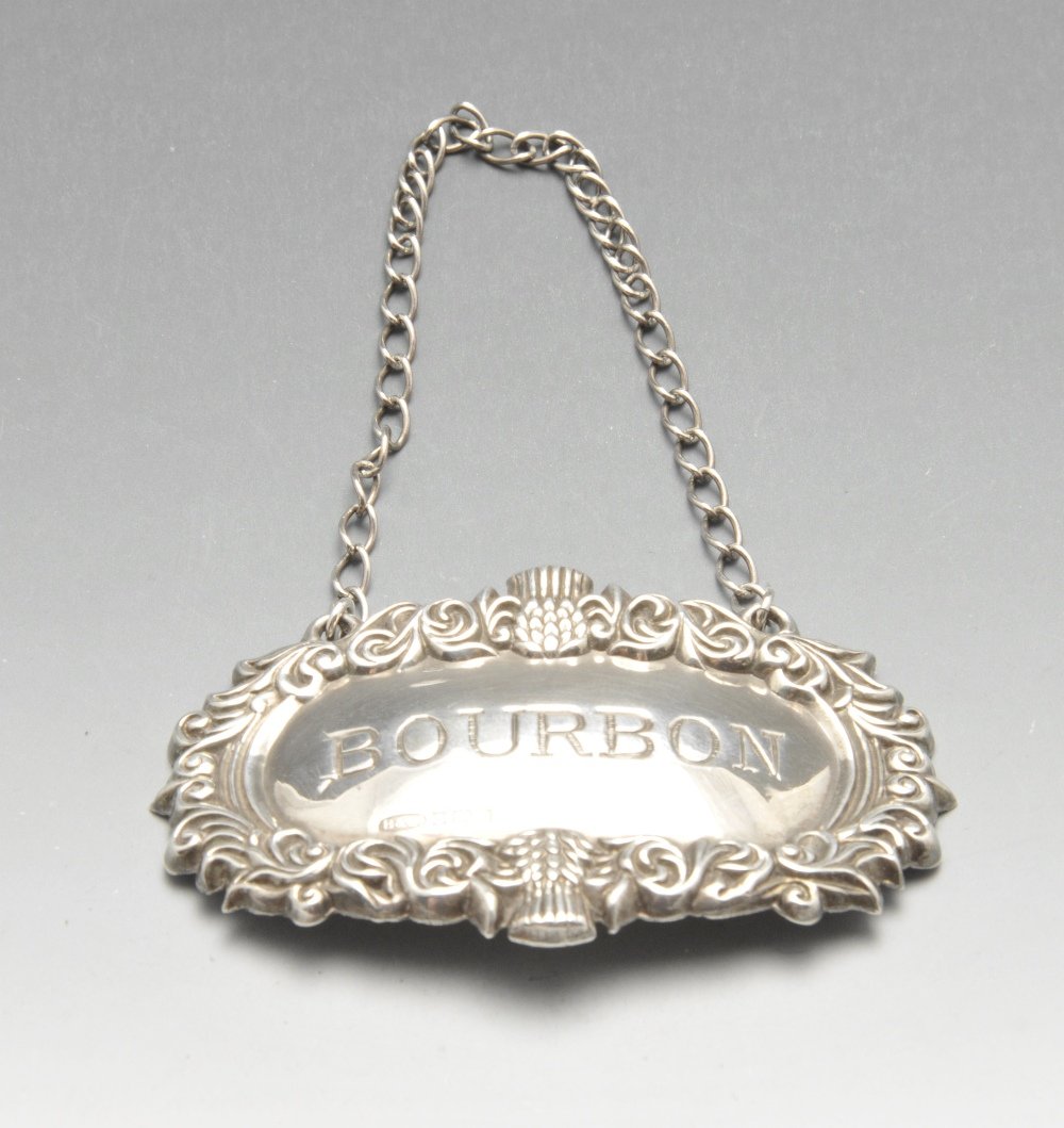 A modern silver wine label, engraved 'Bourbon' and with