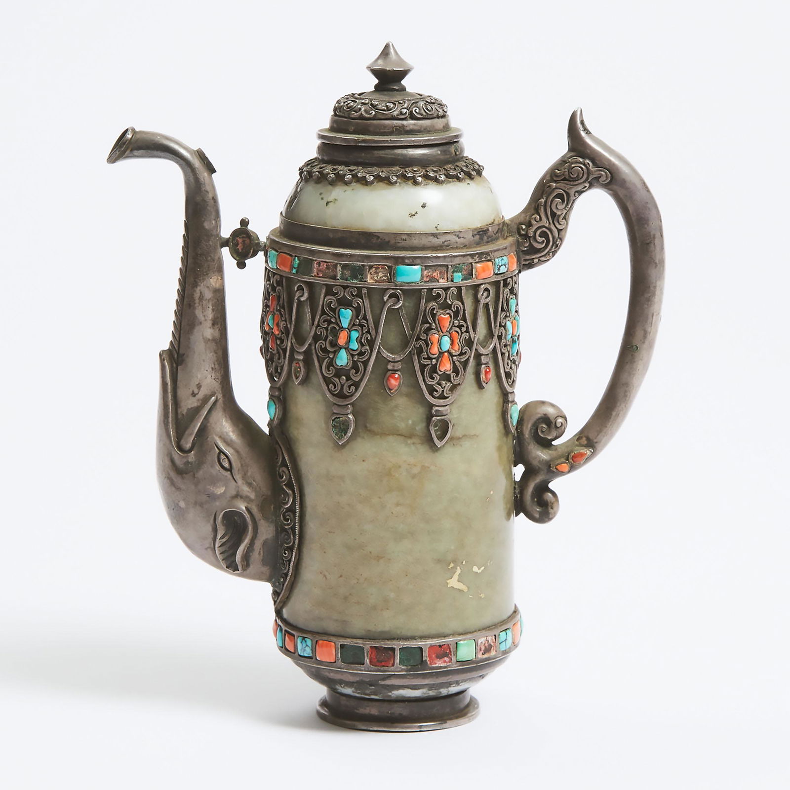 A Mottled Celadon Jade Silver-Mounted Teapot, Tibet/Mongoli