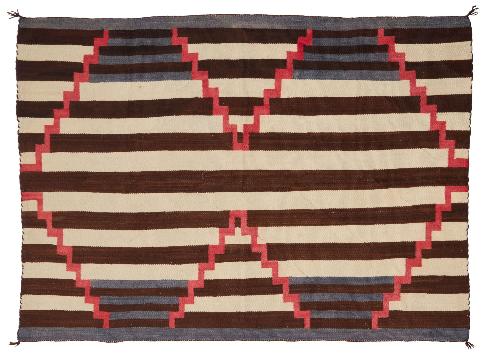 SoldA Navajo Third Phase chief's blanket / rugLate 19th/early 20th century, of hand-spun cream, brown and red wool, of banded and serrated diamond design, 4'4'' H x 6'3'' W, est: $1500/2000 Provenance: Private Collection, Ventura, CASee Sold Price