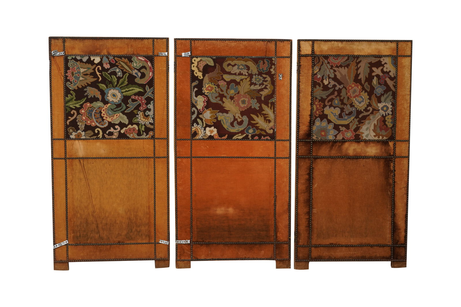 A Needlepoint and Velvet Three-Panel Screen