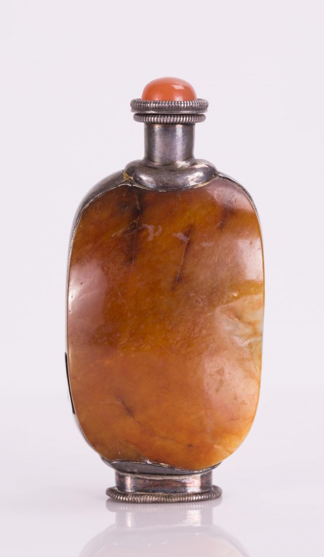 A NEPHRITE JADE SNUFF BOTTLE W/ SILVER MOUNT