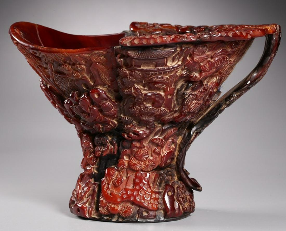 A NIUJIAO CARVED LANDSCAPE PATTERN CUP