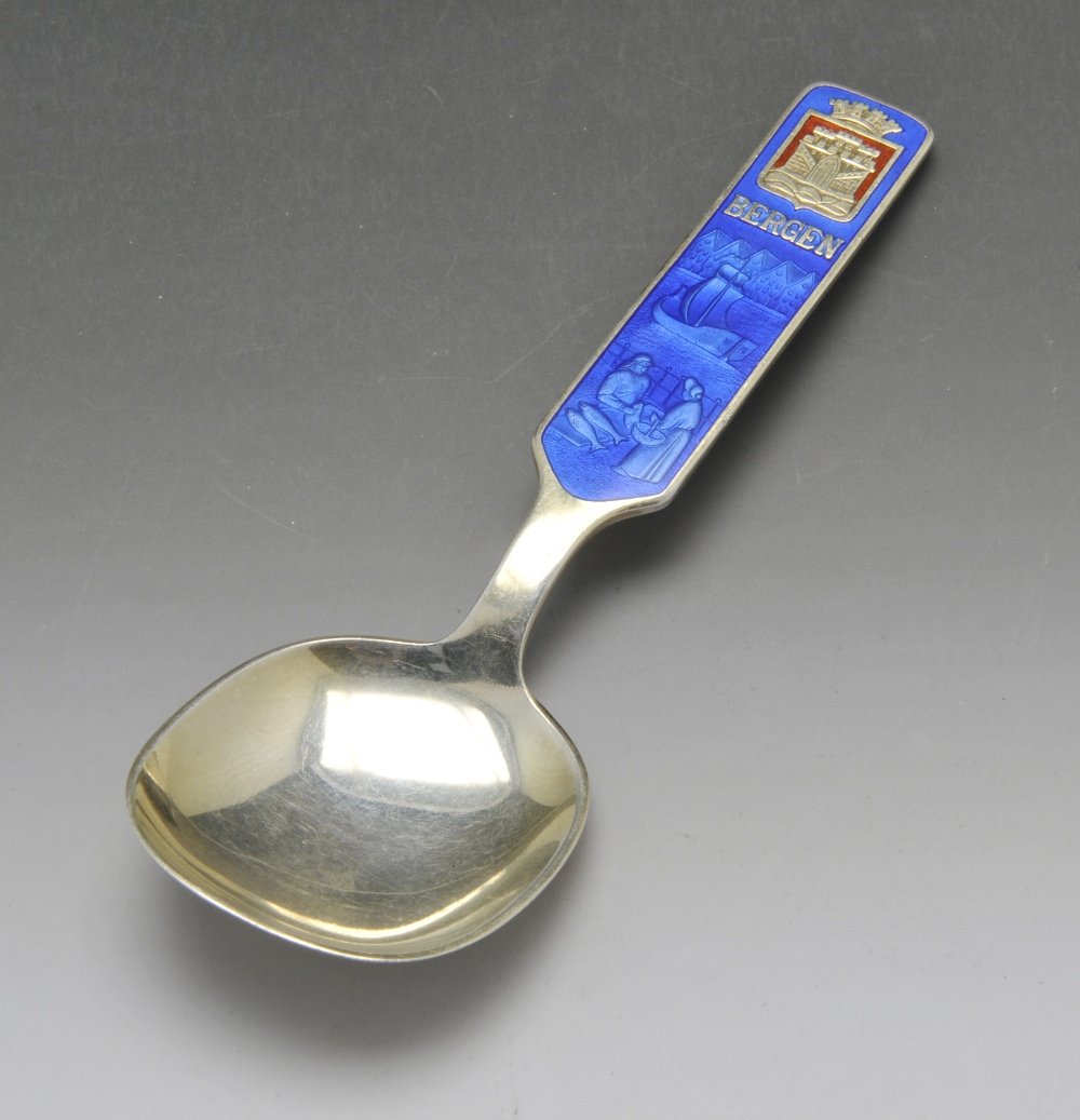 SoldSeventeen Enameled Silver and Silver Gilt Serving Spoons and Souvenir Spoons Seventeen Enameled Silver and Silver Gilt Serving Spoons and Souvenir Spoons Late 19th/Early 20th Century including a pair of Danish enameled silver serving spoons, a Russian enamel serving spoon, tenSee Sold Price