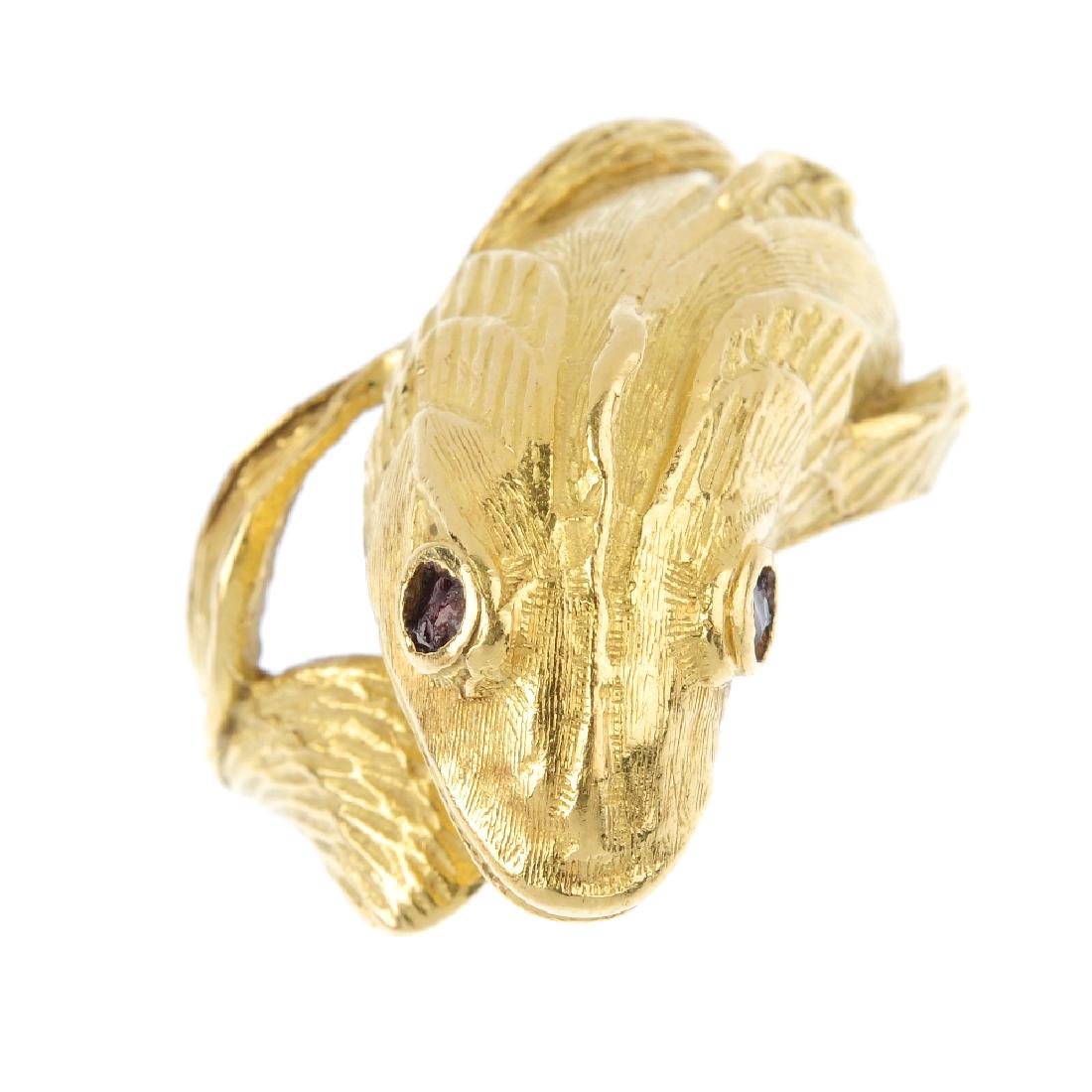 A novelty ring. Designed as a textured fish, with red