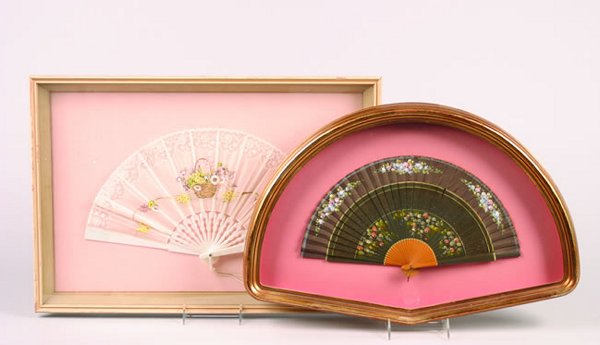 Sold(2) 19th c. hand painted fans in shadowboxesPair of 19th century hand painted fans mounted in gilt shadowbox frames: (1) black satin with pink roses, 18"h x 28"w, and (1) black lace and tortoiseshell, with panels of painted cupids, artist signeSee Sold Price