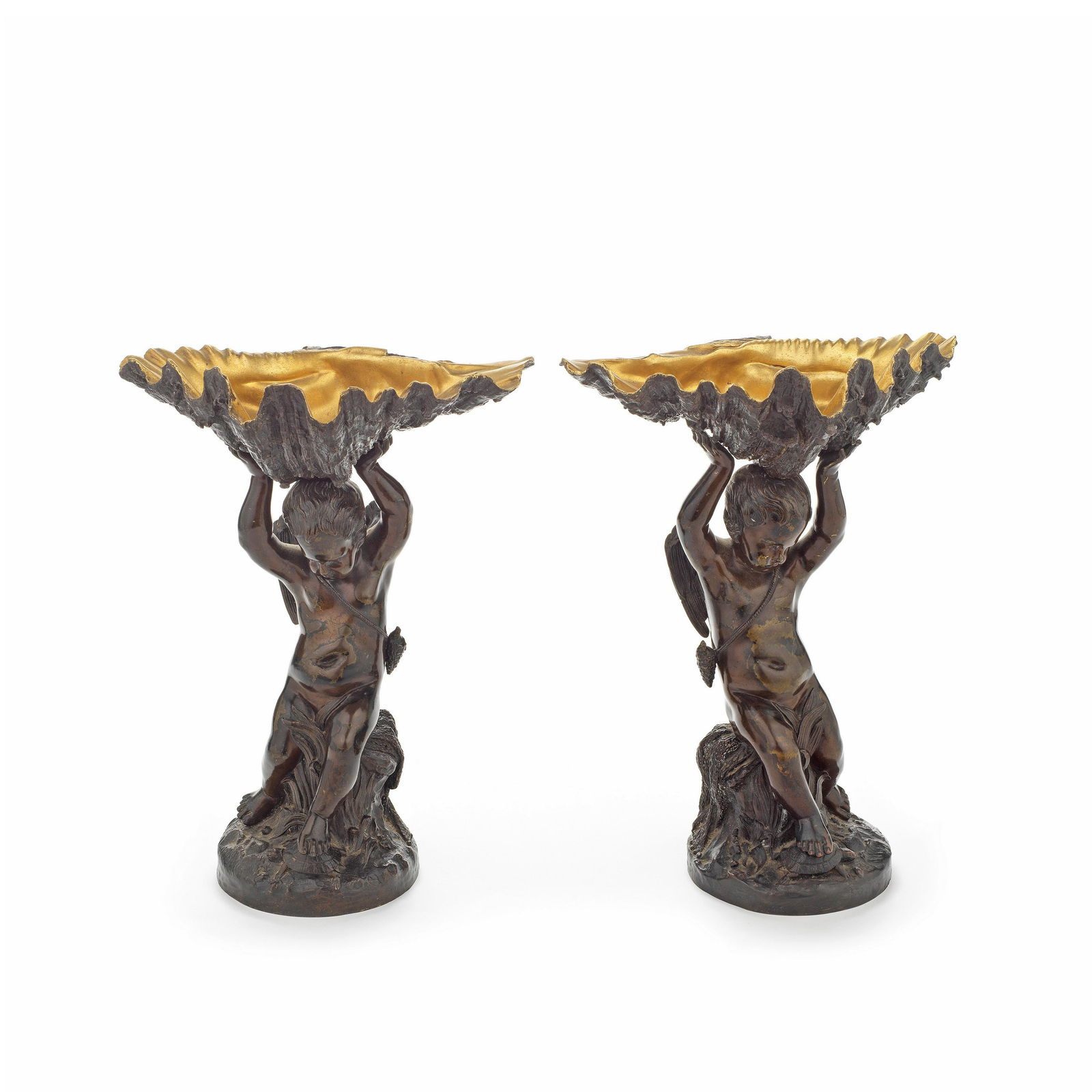 SoldA pair of 19th century French parcel gilt and patinated bronze figural garniture tazze (2)A pair of 19th century French parcel gilt and patinated bronze figural garniture tazze formed as winged putti with conch shells strung around their chests supporting large clam shells above their headSee Sold Price
