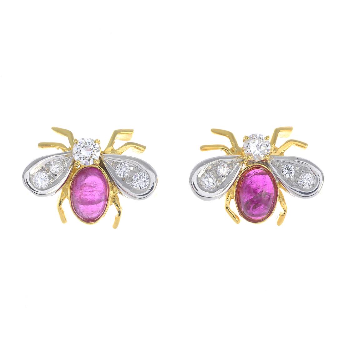 A pair of bee earrings, each set with a ruby cabochon
