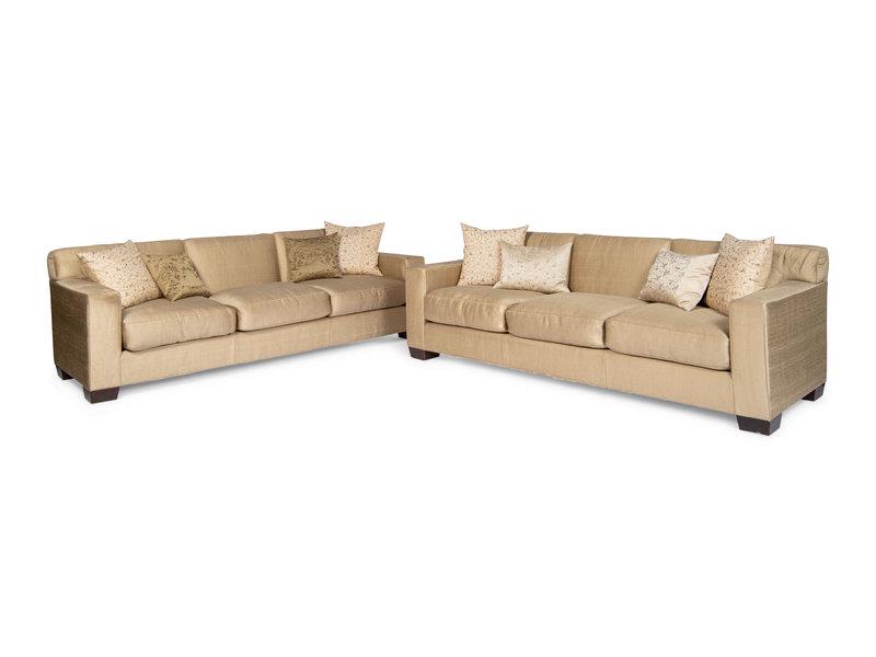 SoldPair of of Decorator Sofas (2)Custom sofas, loose cushion construction, upholstered in gold silk. 96"H. x 36"D. x 31"H. Mansion Master Suite. NO RESERVE. This lot was formerly the property of well-known real estate developer Mr. MSee Sold Price