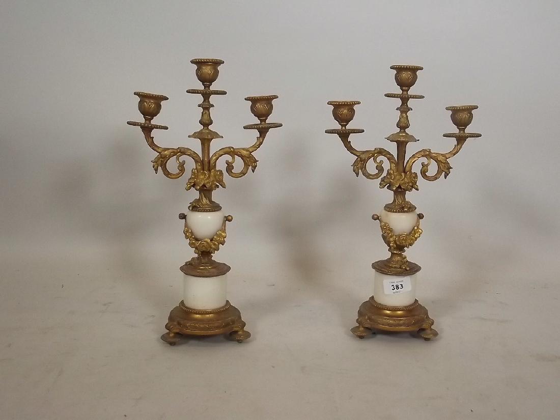 A pair of marble and ormolu mounted three branch